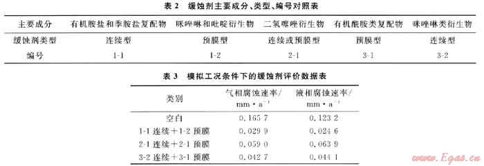針對(duì)國(guó)外高含硫氣田已成熟應(yīng)用的商業(yè)產(chǎn)品,結(jié)合普光氣田濕氣集輸工藝的腐蝕特點(diǎn),選取了連續(xù)型和預(yù)膜型2種類型緩蝕劑。根據(jù)緩蝕劑在高含硫介質(zhì)條件下的成膜特性,優(yōu)選了有機(jī)胺鹽和季胺鹽復(fù)配物、咪唑啉和吡啶衍生物、二氫噻唑衍生物、有機(jī)酰胺類復(fù)配物、咪唑啉類衍生物共5類緩蝕劑產(chǎn)品,具體類型見表2。