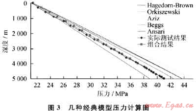 (2) 根據(jù)其生產(chǎn)數(shù)據(jù):油、水、氣產(chǎn)量(qo、qw、qg)和相對密度(γo、γw、γg)及井口壓力(pwn)、溫度(Twh),分別用不同的兩相管流模型計算并繪出壓力分布曲線。