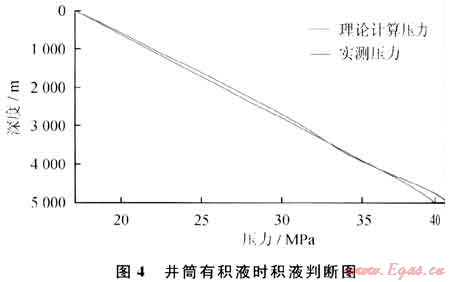 依照該模型,可進行該井的壓力計算和積液判斷。7月1日該井井口實測數(shù)據(jù):產(chǎn)油量35.90m3/d,產(chǎn)水量16.63m3/d,產(chǎn)氣量2.83×104m3/d,井底溫度137.27℃,井口壓力17.20MPa,其計算結(jié)果如圖4所示。由圖4可知:計算壓力曲線與實測曲線在井底出現(xiàn)了較大偏差,故判斷井底有積液,由公式(4)計算得積液深度為4774.68m。