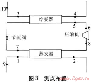 為了研究空調(diào)系統(tǒng)運(yùn)行參數(shù)與故障之間的關(guān)系,挑選出對(duì)故障敏感的運(yùn)行參數(shù),測(cè)點(diǎn)的選擇應(yīng)基于整個(gè)空調(diào)系統(tǒng),包括冷卻水側(cè)、冷水側(cè)及制冷劑側(cè)。由上述理論分析可知,冷水機(jī)組冷凝器水側(cè)受阻將引起蒸發(fā)溫度、冷凝溫度、壓縮機(jī)吸氣溫度、壓縮機(jī)排氣溫度、冷水供回水溫度、冷卻水進(jìn)出水溫度發(fā)生變化,因此應(yīng)對(duì)這些參數(shù)進(jìn)行測(cè)量。測(cè)點(diǎn)的布置見圖3,測(cè)量的參數(shù)名稱、測(cè)點(diǎn)位置及測(cè)量方式見表2。