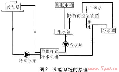 實(shí)驗(yàn)系統(tǒng)的原理見圖2。制冷機(jī)房中設(shè)置單螺桿式冷水機(jī)組、冷水泵和冷卻水泵各1臺(tái),以及分水器和集水器。冷卻水經(jīng)冷卻水泵加壓后進(jìn)入冷水機(jī)組,吸收熱量后被送至屋頂?shù)睦鋮s塔,經(jīng)冷卻降溫后又返回冷水機(jī)組,完成循環(huán)。冷水則是經(jīng)過(guò)冷水泵加壓后進(jìn)入冷水機(jī)組,被冷卻降溫后進(jìn)入分水器,之后進(jìn)入冷負(fù)荷控制裝置中,與自來(lái)水混合后進(jìn)入集水器,再被加壓送入冷水機(jī)組,完成循環(huán)。