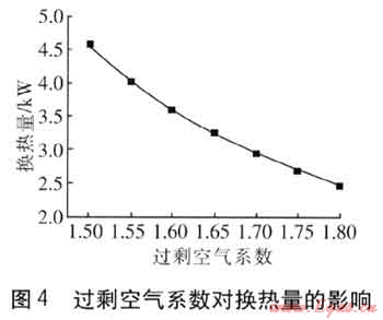 過(guò)剩空氣系數(shù)改變會(huì)影響煙氣進(jìn)口溫度[2],也會(huì)引起煙氣流量變化,使煙氣側(cè)換熱效果發(fā)生變化[3]。保持其他參數(shù)不變,過(guò)??諝庀禂?shù)從1.5增至1.8。根據(jù)燃燒后煙氣總焓不變的原則,計(jì)算出不同過(guò)剩空氣系數(shù)下的煙氣溫度和煙氣流量,代入單管模型進(jìn)行計(jì)算,計(jì)算的換熱量見(jiàn)圖4。過(guò)??諝庀禂?shù)每下降0.1,換熱量可增大20%左右。過(guò)??諝庀禂?shù)增大時(shí),煙氣流量雖然增加,但因燃燒溫度降低使煙氣流速減小,hf減小,使傳熱量減小。故應(yīng)在保證污染物排放不超標(biāo)的前提下,盡量減小過(guò)剩空氣系數(shù)。