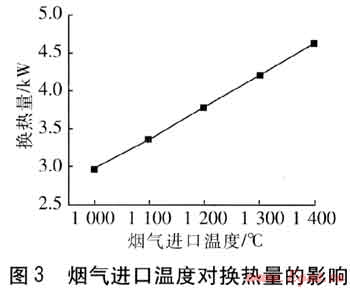 煙氣進(jìn)口溫度受燃?xì)馊紵隣顩r影響,并對(duì)傳熱系數(shù)產(chǎn)生影響。保持其他參數(shù)不變,只改變煙氣進(jìn)口溫度,從100℃上升至1400℃,計(jì)算的換熱量見(jiàn)圖3。隨著煙氣進(jìn)口溫度的升高,傳熱系數(shù)增大,換熱量增加,在燃?xì)夂牧坎蛔兊那疤嵯?,可有效地提高熱水器的換熱效率。煙氣進(jìn)口溫度每升高100℃,換熱量可增加10%以上。