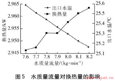 水質(zhì)量流量變化會(huì)引起水的流速變化,影響水側(cè)的傳熱系數(shù),也影響水與煙氣的換熱時(shí)間[4]。保持其他參數(shù)不變,水質(zhì)量流量從7.6kg/min變化到8.2kg/min,換熱量與出口水溫的變化見(jiàn)圖5。由圖5可知,水質(zhì)量流量增大,雖然出水溫度有所下降,但總的換熱量是增加的,換熱器換熱效率提高??梢钥紤]調(diào)節(jié)燃?xì)饬髁颗c調(diào)節(jié)水質(zhì)量流量相結(jié)合來(lái)進(jìn)行燃?xì)鉄崴鞯乃疁乜刂?,提升水溫小幅變化時(shí)熱水器的換熱效率。