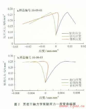 實驗結(jié)果表明,水平方向取樣的巖樣平均楊氏模量為4.70×104 MPa,抗壓強度為69.18 MPa,平均泊松比為0.227;垂直方向取樣的巖樣平均楊氏模量為2.99×104MPa,抗壓強度為l51.92 MPa,平均泊松比為0.175(表2)。