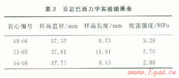 選取頁巖基質(zhì)巖石樣品,通過實驗測量,頁巖樣品抗張強度介于2~4 MPa,平均為2.94 MPa(表3)。