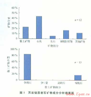 1)四川盆地M組頁巖礦物組分主要以石英礦物、黏土礦物及碳酸鹽巖礦物為主,其中石英礦物含量占43.41%,黏土礦物含量占22.52%,碳酸鹽巖礦物含量占l6.67%。黏土礦物中主要以伊利石、綠泥石為主。