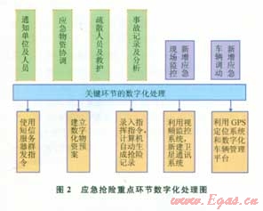如果采用數(shù)字化指揮,還可以增加幾個常規(guī)過程所不具備的環(huán)節(jié),圖2是應(yīng)急搶險關(guān)鍵環(huán)節(jié)的數(shù)字化處理思路。