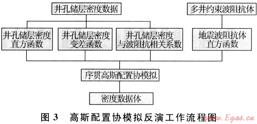 高斯配置協(xié)模擬實(shí)質(zhì)是將地質(zhì)統(tǒng)計(jì)學(xué)理論融入隨機(jī)反演中,隨機(jī)反演在一定地質(zhì)模式指導(dǎo)下進(jìn)行,從而保證反演結(jié)果具有一定的地質(zhì)意義。其具體工作流程(圖3)如下:利用測(cè)井密度曲線(xiàn)與波阻抗反演結(jié)果的相關(guān)性,把約束稀疏脈沖波阻抗反演結(jié)果作為隨機(jī)模擬先驗(yàn)信息,使其成為橫向外推的約束條件,把密度曲線(xiàn)作為第一類(lèi)數(shù)據(jù),波阻抗結(jié)果作為第二類(lèi)數(shù)據(jù),通過(guò)對(duì)常規(guī)波阻抗結(jié)果和密度曲線(xiàn)的直方圖、變差函數(shù)分析,用地質(zhì)統(tǒng)計(jì)學(xué)原理反演出第一類(lèi)數(shù)據(jù),進(jìn)而得到密度的模擬結(jié)果。