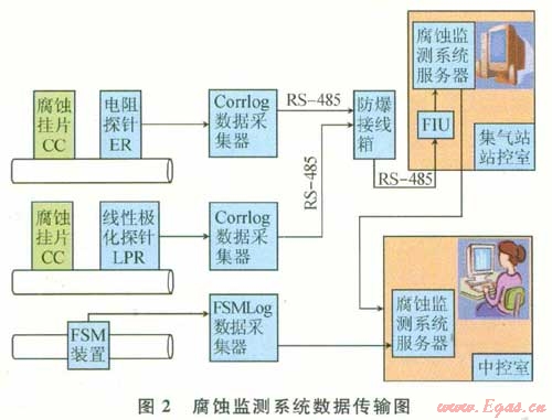 3 普光氣田地面集輸腐蝕監(jiān)測(cè)系統(tǒng)的構(gòu)成及數(shù)據(jù)傳輸流向