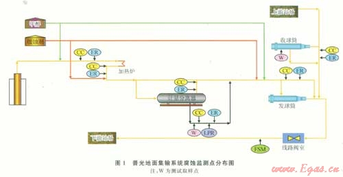 針對(duì)普光氣田地面集輸工藝及各種監(jiān)測(cè)技術(shù)的特點(diǎn),在集氣站和集氣總站設(shè)置水分析取樣點(diǎn),采用腐蝕掛片法(CC)、電阻探針?lè)?ER)、線(xiàn)性極化探針?lè)?LPR)、定期進(jìn)行鐵離子分析等方法,在集輸管網(wǎng)的線(xiàn)路管道上采用FSM電指紋方法進(jìn)行腐蝕監(jiān)測(cè)。