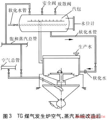 我們查閱了TG爐的設(shè)計資料和實際安裝資料,發(fā)現(xiàn)爐底飽和空氣送風(fēng)口設(shè)計安裝不合理,送風(fēng)口設(shè)計安裝位置在灰斗上部的6號、7號孔之間一側(cè),并未設(shè)計安裝在爐條支架下的十字梁中間(此處是爐膛中心)。由于送風(fēng)口不在爐膛中心線上,飽和空氣送出后又直接吹到錐體結(jié)構(gòu)的灰斗上,這就造成了氣化劑分布不均勻。因此,解決問題的方法就是拆除灰斗錐形閥并改為插板閥,同時將飽和空氣送風(fēng)口設(shè)置在爐膛中心線上。這樣既解決了布風(fēng)不均勻的問題,又解決了灰斗錐形閥拉桿經(jīng)常因排紅渣而燒斷的問題。TG煤氣發(fā)生爐空氣、蒸汽系統(tǒng)改造后見圖3。