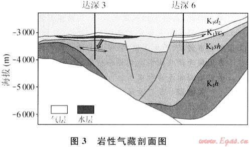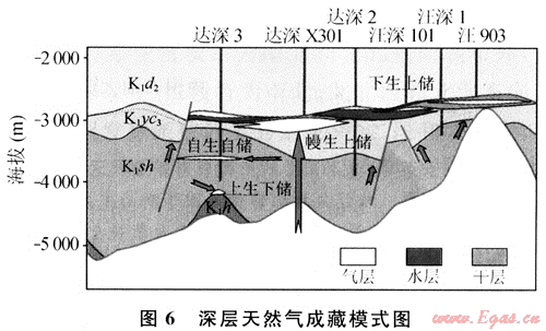這種氣藏是在構(gòu)造背景下,由于地層發(fā)生尖滅或被剝蝕后,上部致密地層超覆形成天然氣藏,通??煞譃槲挥诘貙硬徽厦嬉陨虾筒徽厦嬉韵聝煞N。這種氣藏類型主要發(fā)育在徐家圍子斷陷地層被剝蝕地區(qū),在目前已鉆探井中,僅有升深6井(沙河子組砂礫巖)揭示為這種氣藏類型(圖4)。該氣藏位于兩個(gè)向斜之間的構(gòu)造高部位上,發(fā)育在營四段與沙河子組形成削蝕不整合面以下的沙河子組圈閉中。