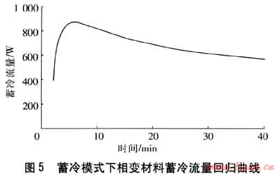 Φc與P之差即為相變材料蓄冷流量(回歸曲線見圖5),由于前2min實驗數(shù)據(jù)不穩(wěn)定且存在Φc<P的情況,因此曲線從第2min給出。隨著運行時間的推移,壓縮機逐漸穩(wěn)定運行,制冷劑與相變材料的換熱流量不斷增大,初期提取的熱量為液態(tài)相變材料的液相顯熱,當相變材料溫度進入相變區(qū)間時,制冷劑取出的熱量為相變潛熱。