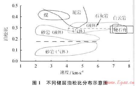 地下介質(zhì)(包括巖層和流體)具有不同泊松比值,國(guó)內(nèi)外學(xué)者在20世紀(jì)70年代對(duì)泊松比與巖性、流體的關(guān)系進(jìn)行了大量研究。漢密爾頓、格里哥里等得到了泊松比與巖石孔隙中流體性質(zhì)關(guān)系的最有價(jià)值的結(jié)果有:①未固結(jié)的淺層鹽水飽和沉積巖往往具有很高的泊松比(大于0.4),這實(shí)際上與泥頁(yè)巖相近;②泊松比往往隨孔隙度的減小及沉積物的固結(jié)而減??;③高孔隙度的鹽水飽和砂巖往往具有較高泊松比(0.3~0.4),這是砂巖含水飽和的情況;④氣飽和高孔隙砂巖往往具有低泊松比,可能低到0.1。這說(shuō)明含氣層泊松比很低,含水層泊松比明顯增高,致密層更高。更多的研究成果還表明[1~3]:泥頁(yè)巖層泊松比高于砂巖層,碳酸鹽巖地層與砂泥巖層相似。碳酸鹽巖和砂泥巖地層中,含氣與含水的泊松比均有一個(gè)分界線(xiàn),砂巖地層差異更明顯,石灰?guī)r地層差異略小,但都能分辨出氣水??梢杂檬疽鈭D(圖1)說(shuō)明儲(chǔ)層泊松比的普遍規(guī)律。