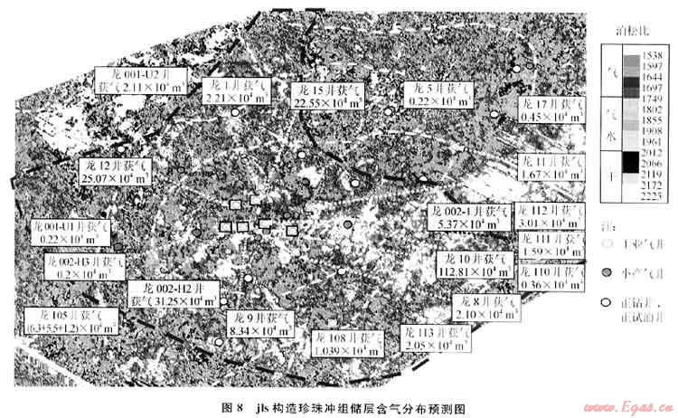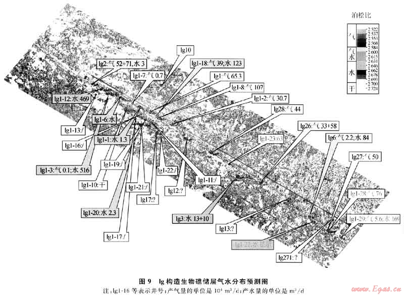 圖9為lg構(gòu)造二疊系生物礁儲(chǔ)層氣水分布預(yù)測(cè)圖。該圖展示,構(gòu)造中部北東南西向有一明顯分界線(xiàn),西南(左下半部)為臺(tái)地相沉積區(qū),西北部為海槽,中間為臺(tái)緣。預(yù)測(cè)臺(tái)地為含水及差儲(chǔ)層區(qū),中間為臺(tái)緣部位,為預(yù)測(cè)的含氣帶,東北部為海槽,預(yù)測(cè)出大片含氣區(qū)。該構(gòu)造儲(chǔ)層段鉆探大量井位,前期在臺(tái)緣部位取得較好效果,高產(chǎn)井較多(黃色、綠色文字框所示),但后來(lái)鉆遇大量氣水井或水井(綠色或藍(lán)色文字框所示),尤其在臺(tái)地部位部署的井位基本上為干井或水井(白色或藍(lán)色文字框所示),獲氣井很少。氣水預(yù)測(cè)結(jié)果與實(shí)鉆結(jié)果基本吻合。預(yù)測(cè)還表明,該區(qū)海槽部位還有大片含氣區(qū),但該區(qū)僅有l(wèi)g10井鉆達(dá)目的層,且不產(chǎn)氣,雖然該井預(yù)測(cè)與實(shí)鉆吻合,但沒(méi)有更多的井來(lái)證實(shí),且該區(qū)儲(chǔ)層情況還存在認(rèn)識(shí)上的爭(zhēng)議,要靠將來(lái)的實(shí)鉆進(jìn)一步驗(yàn)證。