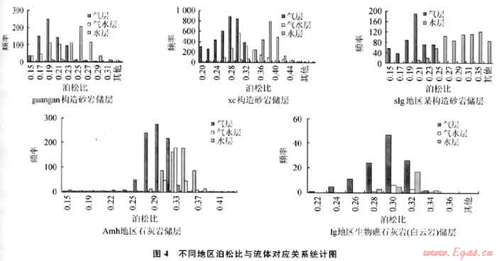 圖4為國(guó)內(nèi)外某些地區(qū)儲(chǔ)層泊松比測(cè)井資料與流體對(duì)應(yīng)關(guān)系統(tǒng)計(jì)圖。從圖中可見(jiàn),盡管地區(qū)不同,儲(chǔ)層類(lèi)型不同,但氣水關(guān)系始終具有一致特點(diǎn),即低泊松比對(duì)應(yīng)含氣,中泊松比對(duì)應(yīng)同含氣水,中高泊松比對(duì)應(yīng)含水,高泊松比對(duì)應(yīng)巖層。與前人研究成果都是一致的,只是具體儲(chǔ)層情況有分布范圍的差別。這也說(shuō)明泊松比這些特點(diǎn)是由儲(chǔ)層及流體的物理性質(zhì)決定的,這種明確的關(guān)系確保了應(yīng)用泊松比進(jìn)行流體識(shí)別的可靠性。