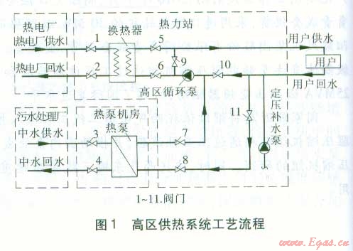 污水處理廠內(nèi)建有中水泵站l座,安裝3臺流量為625 m3h、揚(yáng)程為40 m的循環(huán)泵,流量滿足熱泵需求,中水循環(huán)泵采用變頻調(diào)速(由供回水壓差控制)。將中水作為熱泵的低溫?zé)嵩?,在小區(qū)內(nèi)建造熱泵機(jī)房1座。將熱泵作為基本熱源,承擔(dān)設(shè)計負(fù)荷的75%左右。熱電廠作為峰荷熱源,并在嚴(yán)寒期單獨(dú)運(yùn)行。小區(qū)內(nèi)建熱力站4座,由于l8層建筑比較分散,因此在1~3號熱力站內(nèi)分別設(shè)置l套高區(qū)系統(tǒng)和l套低區(qū)系統(tǒng),4號熱力站只設(shè)置l套低區(qū)系統(tǒng)。高區(qū)、低區(qū)供熱系統(tǒng)的工藝流程分別見圖1、2。
