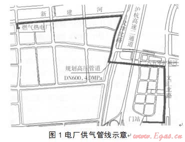 由于城市門站直線距離電廠不足3kin,管線距離僅4.5km,為此電廠所需天然氣從市門站接出,并用專線直供電廠。考慮到電廠二期擴(kuò)建及減少啟停和事故狀態(tài)下對(duì)天然氣管網(wǎng)的沖擊,管徑選擇為DN600。但是目前的城市門站只能滿足電廠一期工程的需要,為此一期供氣工程利用現(xiàn)狀高壓系統(tǒng),在現(xiàn)狀進(jìn)站總管設(shè)置三通后,經(jīng)計(jì)量(成撬設(shè)置)后直供電廠。同