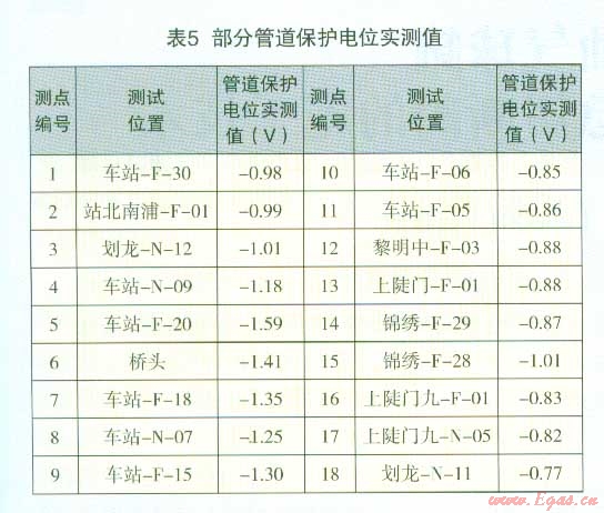 區(qū)域二兩座深井陽極安裝后,對管網(wǎng)進(jìn)行了-段時(shí)間的極化,各測試點(diǎn)保護(hù)電位測試結(jié)果見表5,大多數(shù)檢測點(diǎn)的電位在-0.85V至-l.5V之間,達(dá)到了保護(hù)電位,但也有小部分電位在-0.85V以卜達(dá)不到保護(hù)電位,個(gè)別在-1.5v以下,管網(wǎng)處于過保護(hù)狀態(tài)。