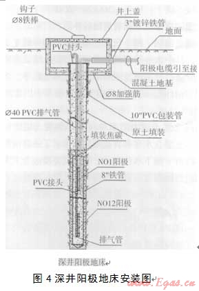 公司于2011年3月苗‘先啟動了Ⅸ域二的深井陽極電流保護(hù)工程。經(jīng)計(jì)算管道保護(hù)面積為19 631m2,設(shè)計(jì)保護(hù)電流密度為lomA/m2,保護(hù)總電流為196A,在南浦氣化站和位于車站大道的公用集團(tuán)內(nèi)各設(shè)置1座深井陽極陰極保護(hù)站。每個(gè)站內(nèi)設(shè)l00A/100V恒電位儀2臺,-開-備。在站內(nèi)距離管線50m~100m的低洼潮濕、土層較厚處鉆建直立式陽極地床,升深60m,井內(nèi)裝分段預(yù)制型陽極體7組,規(guī)格為Ф325×6 000,內(nèi)裝Ф75×1 500高硅鑄鐵陽極3支。將高硅鑄鐵陽極、高性能碳素填料,PVC排氣管,部分陽極引線電纜,井套管組合裝配為-體,便于運(yùn)輸和安裝,并可保證裝配精度和質(zhì)量(圖4)。每500m左有設(shè)置-個(gè)測試樁或在原有閥門井內(nèi)設(shè)置測試點(diǎn)。對于平行或跨越管道按-定間距或在最接近處作均壓處理,使電位分布均衡。
