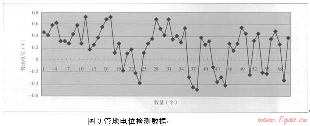 對整體管道的自然電位測試和原犧牲陽極保護(hù)系統(tǒng)進(jìn)行測試,大部分管道處在自然腐蝕電位狀態(tài)(-0.45V,Cu/CuS04參比電極),所測的60處管地電位在-0.49V~-0.72V之間波動(見圖3),其中正值占77%,最負(fù)值-0.49V,達(dá)不到管道陰極保護(hù)電位(即管/地界面極化電位)要求的-0.85V,即管道運(yùn)行沒有處于陰極保護(hù)狀態(tài)。