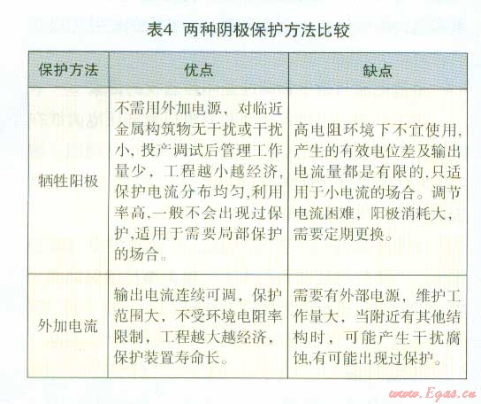 陰極保護(hù)是給被保護(hù)物體通以陰極電流,使之陰極極化減小或防止金屬腐蝕的方法,主要有犧牲陽極法和外加電流法(也稱強(qiáng)制電流法)兩種,兩者比較如表4。