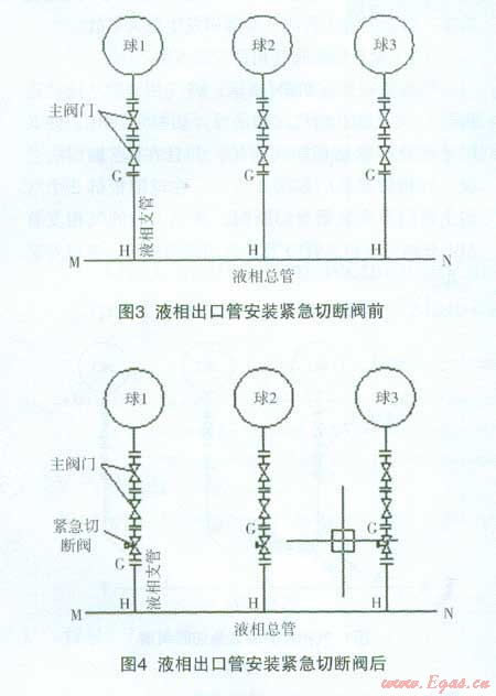 根據(jù)《氣瓶安全監(jiān)察規(guī)定》:《氣瓶充裝許可證》的有效期為4年;有效期滿前,氣瓶充裝單位應(yīng)當(dāng)向原審批部門申請更換《氣瓶充裝許可證》。我公司的液化石油氣儲灌站于2011年7月向河北省質(zhì)監(jiān)局提出《氣瓶充裝許可證》的換證申請;河北省特種設(shè)備學(xué)會于2011年11月對液化石油氣儲灌站進(jìn)行了現(xiàn)場評審。評審專家根據(jù)新版《城鎮(zhèn)燃?xì)庠O(shè)計(jì)規(guī)范》中關(guān)于對“液化石油氣儲罐上安全閥件的配置”,要求我液化石油氣儲灌站3座400m,的液化石油氣球罐的氣相管和液相出口管上的根部主閥門下加裝緊急切斷閥。