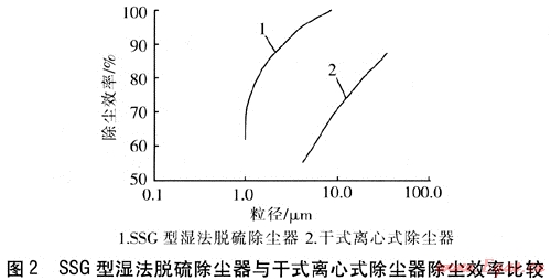 SSG型濕法脫硫除塵器與干式離心式除塵器除塵效率比較見圖2。由圖2可知,對(duì)于粒徑為1~10μm的飄塵,SSG型濕法脫硫除塵器的除塵效率為60%~100%;對(duì)于粒徑為6~10μm的飄塵,干式離心式除塵器的除塵效率為55%~70%;而對(duì)于粒徑為6μm以下的飄塵,干式離心式除塵器幾乎沒有捕集能力。SSG型濕式除塵器除塵效率曲線總是位于干式離心式除塵器除塵效率曲線的上方,無(wú)論對(duì)于何種粒徑的煙塵,SSG型濕法除塵器的除塵效率均大于干式離心式除塵器。