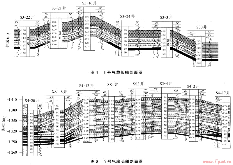 由于Ⅱ號(hào)和Ⅳ號(hào)氣藏都是多層疏松砂巖,繪制氣藏長軸剖面圖如圖4、5所示。