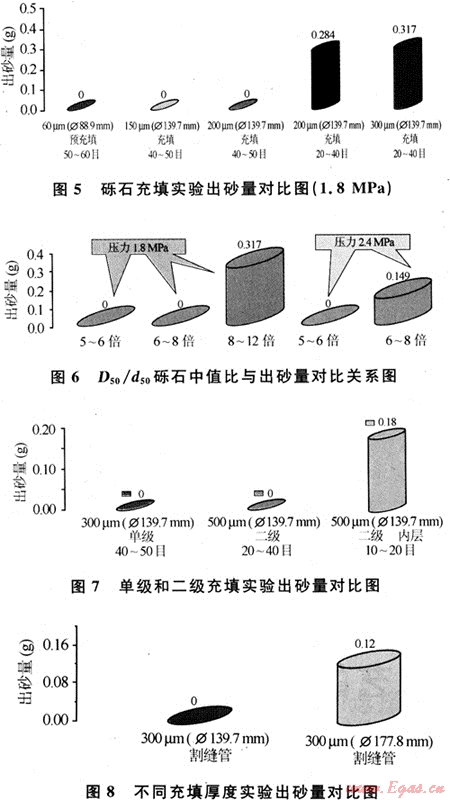 從試驗(yàn)結(jié)果可以看出:①相同生產(chǎn)壓差下,充填礫石尺寸越大越容易出砂;對于相同尺寸的礫石,降低生產(chǎn)壓差可以減少出砂甚至不出砂;在兩種壓差下,D50/d50比值為5~6倍時(shí),出砂量為零,提高壓差,在不出砂的條件下單位采氣指數(shù)略有增高。②對礫石充填防砂,防砂效果與充填厚度有關(guān),厚度太小或?qū)е路郎笆。瑐鹘y(tǒng)理論認(rèn)為充填厚度應(yīng)大于20mm,盡可能保證充填厚度大于30mm;兩級充填時(shí)的防砂效果主要決定于外層礫石,采用多級防砂時(shí),若要防止砂產(chǎn)出,應(yīng)盡可能增加外層礫石的充填厚度。