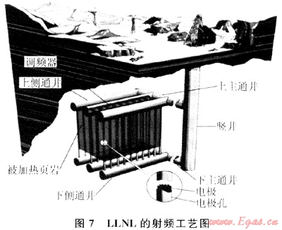 1970年代后期美國伊利諾理工大學(xué)提出利用射頻加熱油頁巖。該技術(shù)利用垂直組合電極緩慢加熱大規(guī)模深層的頁巖層。后來由Lawrence Livermore國家實驗室(LLNL)進(jìn)行開發(fā)。LLNL提出利用無線射頻的方式加熱頁巖,克服了傳導(dǎo)加熱需要大量的熱擴散時間的缺點。具有穿透力強,容易控制等優(yōu)點(圖7)[12~14]。