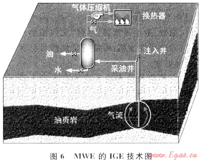 工藝流程:先將高溫蒸汽注入油頁巖地層中,對流加熱油頁巖,與油頁巖換熱后,把熱解生成的油氣載到地面上來,冷凝、回收。分離后的不凝氣被加熱到一定溫度后通入到地層與油頁巖換熱,循環(huán)利用(圖6)。MWE公司稱,該工藝中1口井的覆蓋面積可達(dá)3000m2,產(chǎn)油超過8100t/a[12]。