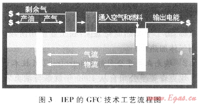 該工藝流程(圖3)為:利用高溫燃料電池堆的反應(yīng)熱直接加熱油頁巖層,使其中的有機質(zhì)熱解產(chǎn)生烴氣,然后導(dǎo)入到采油井,被抽到地面上來。除了部分氣體作為燃料被通入燃料電池堆外,其余大部分烴氣經(jīng)冷凝后獲得石油和天然氣。另外,在啟動工藝裝置預(yù)熱油頁巖時期,需要向燃料電池中通入天然氣作為啟動燃料。工藝正常運轉(zhuǎn)后,能量自給自足[9]。