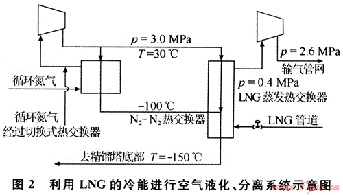 常用的空氣分離法是將空氣液化,通過(guò)氟利昂冷凍機(jī)、透平膨脹機(jī)進(jìn)行空氣的液化和分離,制成液態(tài)的氮?dú)狻⒀鯕?、氬氣等。而LNG冷熱能用于空氣分離則是通過(guò)循環(huán)氮?dú)獾睦鋮s來(lái)實(shí)現(xiàn)(見圖2)。一般來(lái)說(shuō),生產(chǎn)10×104m3的液態(tài)氣體大約需要650×104kJ的冷卻能。利用LNG的冷熱能,循環(huán)氮?dú)鈮嚎s機(jī)可小型化;因不需要冷凍機(jī),建設(shè)費(fèi)用也可相應(yīng)減少;此外,LNG作為空氣分離裝置的預(yù)冷劑,生產(chǎn)液氬的空分裝置中,利用其冷能冷卻和液化由下塔抽出經(jīng)過(guò)復(fù)熱的循環(huán)氮,可以省去氟利昂制冷機(jī)以及氮透平膨脹機(jī)組,使產(chǎn)品能耗平均降低0.5kwh/m3,裝置的投資費(fèi)用可減少10%左右,生產(chǎn)成本降低20%~30%。