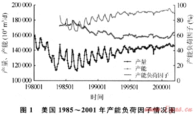 美國的產(chǎn)能負(fù)荷因子直接受氣價的影響,高氣價直接刺激新鉆井和完井工藝的增加,產(chǎn)能也隨之增加,產(chǎn)能負(fù)荷因子降低。而產(chǎn)能負(fù)荷因子反過來又影響價格和鉆井,如果產(chǎn)能負(fù)荷因子超過90%,就會引起儲氣量減少、價格上漲等。當(dāng)天然氣產(chǎn)能負(fù)荷因子低于90%時,天然氣井口平均價格都在0.1美元/m3以下。天然氣價格的低迷導(dǎo)致鉆井和完井?dāng)?shù)量的減少,產(chǎn)能隨之降低,產(chǎn)能負(fù)荷因子上升。如1998~1999年低油氣價格導(dǎo)致天然氣產(chǎn)能負(fù)荷因子增加到90%~92%。