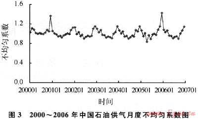 近幾年由于受國家經(jīng)濟宏觀調(diào)控政策和城市環(huán)保要求提高等因素的影響,民用、發(fā)電等用氣增長較快,但民用和采暖用氣的季節(jié)性不均勻問題突出,冬季高月和夏季低月值相差很大。中國石油每年的1、2、3、10、11、12等6個月的不均勻系數(shù)偏大(不均勻系數(shù)為月產(chǎn)量與年均月產(chǎn)量的比值),最高為12月份,連續(xù)6a的12月不均勻系數(shù)都在1.2以上,2005年不均勻系數(shù)達到了1.54的高峰,峰谷差為1.3~1.5倍(圖3)[4~5]。