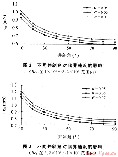 圖2、圖3分別描述了不同表面張力下井斜角與臨界速度的關系。由于定向氣井中井斜角的存在,使得定向氣井的臨界攜液產(chǎn)量要比直井臨界攜液產(chǎn)量大得多;同時隨著井斜角度的增大,氣井的臨界攜液產(chǎn)量逐漸減小,當井斜角為直角時,氣井的臨界產(chǎn)量符合直井的臨界產(chǎn)量。