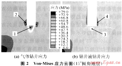 從井壁巖石的應(yīng)力分布可見(jiàn),左側(cè)井壁巖石的Von-Mises應(yīng)力分布與右側(cè)井壁巖石的應(yīng)力分布差別較大,氣體鉆井2區(qū)井壁巖石出現(xiàn)應(yīng)力集中,最大值為79MPa,比鉆井液鉆井4區(qū)井壁巖石應(yīng)力值大,而且等值應(yīng)力分布面積更大,由此可見(jiàn),相同的巖層和巖石強(qiáng)度,氣體鉆井的井壁比鉆井液鉆井時(shí)更不穩(wěn)定,更容易出現(xiàn)井壁不穩(wěn)定現(xiàn)象,鉆進(jìn)時(shí)更容易出現(xiàn)井眼擴(kuò)大,與15°傾斜地層有相同的趨勢(shì)和結(jié)果。