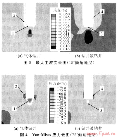 從圖2中2、4區(qū)井壁巖石的應(yīng)力分布可見(jiàn),井壁左側(cè)巖石的Von-Mises應(yīng)力值大于右側(cè)井壁巖石的應(yīng)力值,井壁巖石的應(yīng)力分布是不對(duì)稱的,沿傾斜面的更高一側(cè)井壁應(yīng)力值更大。氣體鉆井中井壁巖石在井底附近出現(xiàn)明顯的應(yīng)力集中,Von-Mises應(yīng)力值最大為79MPa,而鉆井液鉆井在4區(qū)出現(xiàn)的井壁巖石應(yīng)力集中的Von-Mises應(yīng)力值約為70MPa。氣體鉆井在2區(qū)井壁巖石的應(yīng)力區(qū)域面積比鉆井液鉆井4區(qū)的等值應(yīng)力分布面積更大。由此可見(jiàn),相同的巖層和巖石強(qiáng)度,氣體鉆井的井壁比鉆井液鉆井時(shí)更容易成塊掉落,形成坍塌型井眼,造成鉆柱力學(xué)變化,改變井斜規(guī)律。從圖3中還可以看出,氣體鉆井1區(qū)主應(yīng)力大于3區(qū),說(shuō)明氣體鉆井條件下機(jī)械鉆速高,破巖速度也快。氣體鉆井2區(qū)沿左側(cè)井壁巖石比沿右側(cè)井壁巖石具有更大的拉應(yīng)變,如果巖石出現(xiàn)裂縫,將最先在左側(cè)出現(xiàn),而且較右側(cè)更大,巖石的破碎、跨塌將首先出現(xiàn)在左側(cè)。鉆井液鉆井出現(xiàn)相同趨勢(shì)的現(xiàn)象,但是井壁巖石有鉆井液的保護(hù),使得4區(qū)井壁巖石的應(yīng)變小而且分布均勻,其井壁穩(wěn)定性好,在相同巖石情況下,不會(huì)出現(xiàn)嚴(yán)重的坍塌型井眼,不會(huì)影響井斜的發(fā)展規(guī)律。由圖4可見(jiàn),氣體鉆井1區(qū)井底巖石應(yīng)力分布向右面偏斜,即沿向平行于傾斜面的方向偏斜,而鉆井液鉆井的偏斜趨勢(shì)基本相同,但不明顯。氣體鉆井的井底巖石相同等值線應(yīng)力區(qū)域面積較鉆井液鉆井的應(yīng)力區(qū)域面積更大。由于氣體鉆井破巖效率較高,使井眼的傾斜幅度也產(chǎn)生了放大的作用,破壞巖石后形成的井眼有向右面偏斜的趨勢(shì)。