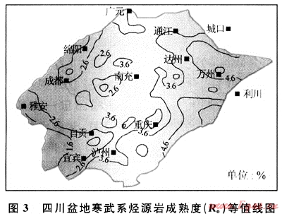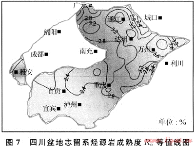 四川盆地下志留統(tǒng)泥質(zhì)烴源巖Ro值為2.2%~4.0%,已演化至過成熟階段。川南地區(qū)成熟度較低,普遍小于2.8%(圖7)。晚二疊世末,志留系源巖Ro值演化至0.9%,開始進入成油期。三疊紀之后,由于沉積速度加快,志留系埋藏速率也相應(yīng)加快,志留系烴源巖在壓力和溫度作用下,熱演化加速。到中三疊世末時,很多地區(qū)的Ro值已迅速演化至1.3%。志留系烴源巖生成大量的液態(tài)烴。中侏羅世后,沉積作用仍然快速進行,志留系地層仍處于快速埋藏狀態(tài),Ro值從1.3%迅速演化至2.2%,有機質(zhì)演化至高成熟期,處于濕氣轉(zhuǎn)化階段。從白堊系開始,大部分地區(qū)的志留系烴源巖有機質(zhì)R。值都超過了3%,進入過成熟期,主要形成干氣。