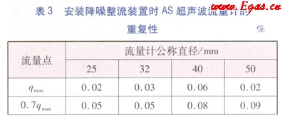 據(jù)國家質(zhì)量監(jiān)督檢驗(yàn)檢疫總局發(fā)布的超聲波標(biāo)準(zhǔn)JJG 1030—2007《超聲流量計(jì)》的要求,的重復(fù)性不能超過相應(yīng)準(zhǔn)確度等級規(guī)定的最相對誤差絕對值的1/5,即作為1.5級的AS流量計(jì)的重復(fù)性,除分界流量點(diǎn)(qt)以下的應(yīng)滿足重復(fù)性≤0.6%外,其他流量點(diǎn)應(yīng)滿足≤0.3%。流量計(jì)的重復(fù)性越小,性能越好。析表3和表4中的數(shù)據(jù),安裝降噪整流裝置的As超聲波流量計(jì)的重復(fù)性比不安裝降噪整流裝置的超聲波流量計(jì)的重復(fù)性要小很多,達(dá)到0.5級AS超聲波流量計(jì)的重復(fù)性的要求。試驗(yàn)證明降噪整流裝置的整流效果在超聲波流量計(jì)的重復(fù)性方面也能體現(xiàn)。