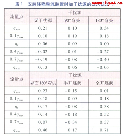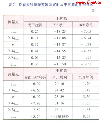 為了使試驗(yàn)結(jié)果更有對比性和說服力,對沒有安裝降噪整流裝置的AS超聲波流量計(jì)進(jìn)行了相同的試驗(yàn)。試驗(yàn)完畢后對數(shù)據(jù)進(jìn)行了統(tǒng)計(jì),具體數(shù)據(jù)見表2。通過數(shù)據(jù)分析,沒有安裝降噪整流裝置的AS超聲波流量汁在以上5種干擾源的環(huán)境下測量出來的相對誤差偏離非常大,最大達(dá)到了-76.11%左右。因半開的蝶閥能使氣流的方向傾斜向管壁,對AS超聲波流量計(jì)的計(jì)量結(jié)果影響最為突出。在檢定qmax流量點(diǎn)時(shí)因受斜向氣流的干擾,AS超聲波流量計(jì)出現(xiàn)了不計(jì)量報(bào)警的異常狀態(tài)。在超聲波流量計(jì)的電子系統(tǒng)中,能有效剔除由混響、電磁干擾等引起的計(jì)量誤差的算法不能消除機(jī)械情況下的干擾引。由此說明降噪整流裝置在整流方面起著決定性的作用。
