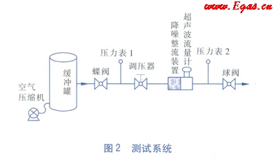試驗(yàn)中,用來產(chǎn)生超聲波噪聲的設(shè)備是調(diào)壓器。在氣體流動(dòng)的過程中,調(diào)壓器兩側(cè)的壓力差越大所產(chǎn)生的超聲波噪聲越大。本測試的方法是:在一個(gè)容積為5m3的緩沖罐中充入空氣,使其內(nèi)部達(dá)到500kPa左右的絕對壓力,緩沖罐的一側(cè)接有DN 50mm的管道,管道上依次接有蝶閥、壓力表1、調(diào)壓器、降噪整流裝置、AS超聲波流量計(jì)、壓力表2和球閥。為了模擬實(shí)際使用現(xiàn)場,特約束了它們之間的距離。蝶閥與壓力表1相距10D(D為管道公稱直徑),壓力表1與調(diào)壓器相距15D,調(diào)壓器與降噪整流裝置相距5D,降噪整流裝置與AS超聲波流量計(jì)直接連接,超聲波流量計(jì)與壓力表2相距10D,壓力表2與球閥相距10D,測試系統(tǒng)見圖2。選用的AS超聲波流量計(jì)規(guī)格為DN 50mm,始動(dòng)流量為0.37m3/h,流量范圍為3~150m3/h。
