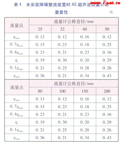 為了使得試驗(yàn)結(jié)果更具有對比性,把各個(gè)口徑的AS超聲波流量計(jì)拆下降噪整流裝置后按照所校驗(yàn)流量點(diǎn)進(jìn)行檢定,并統(tǒng)計(jì)各個(gè)流量點(diǎn)的重復(fù)性,見表4。