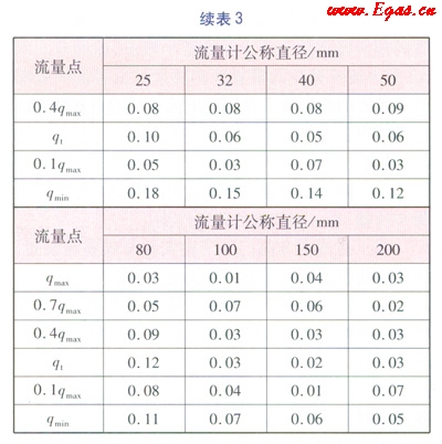 試驗(yàn)的方法為:在標(biāo)準(zhǔn)表校驗(yàn)裝置上被檢表的位置安裝好待測的儀器后,按照校驗(yàn)流量計(jì)的方法分別對qmin、0.1qmax、qt、0.4qmax、0.7qmax和qmax的流量點(diǎn)進(jìn)行校驗(yàn)。qmin為流量計(jì)的標(biāo)稱最小流量;qmax為流量計(jì)的標(biāo)稱最大流量;qt為分界流量,即流量范圍被分割成“高區(qū)”和“低區(qū)”的分界點(diǎn)的流量,“高區(qū)”的準(zhǔn)確度等級為流量計(jì)的標(biāo)稱準(zhǔn)確度等級,“低區(qū)”的準(zhǔn)確度等級為流量計(jì)的標(biāo)稱準(zhǔn)確度等級的2倍。