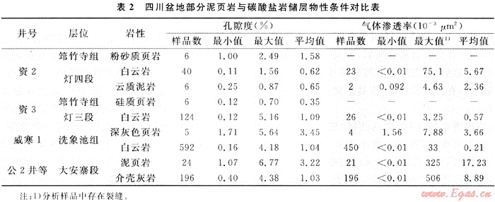 眾所周知,泥頁(yè)巖本身的孔滲性超低而致密,故一般在油氣藏的形成中起封蓋作用。但是,在四川盆地多套含油氣層系中,泥頁(yè)巖與同層的碳酸鹽巖儲(chǔ)層相比,其物性條件相差無(wú)幾(表2)。特別是在有裂縫存在的條件下,泥頁(yè)巖往往也具有較高的滲透能力,可形成·種非常規(guī)油氣層——泥頁(yè)巖裂縫性油氣層(例如侏羅系大安寨和涼高山油氣層)。在四川盆地今后的非常規(guī)油氣勘探中,理應(yīng)重視這種特殊類型的泥頁(yè)巖儲(chǔ)集層。
