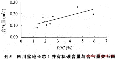 頁(yè)巖氣的勘探生產(chǎn)價(jià)值取決于其中游離氣和吸附氣的含量,游離氣的含量高低與其構(gòu)造保存條件密切相關(guān),而吸附氣含量受溫度、壓力等環(huán)境因素影響,在相同情況下,吸附氣量高低與有機(jī)質(zhì)含量呈正相關(guān)。上揚(yáng)子地區(qū)志留系烴源巖有機(jī)質(zhì)豐度高,預(yù)計(jì)將會(huì)在構(gòu)造保存條件差異較大的地區(qū)分別形成不同含氣量及含氣特點(diǎn)的頁(yè)巖氣聚集。在四川盆地,除已發(fā)現(xiàn)過(guò)去的老井在鉆探志留系頁(yè)巖段時(shí)具有豐富的氣顯示之外,目前完鉆的長(zhǎng)芯1井初步分析結(jié)果顯示,在埋深淺于150 122龍馬溪組頁(yè)巖層段內(nèi),同樣發(fā)現(xiàn)了頁(yè)巖氣存在的證據(jù)(表2)。8個(gè)頁(yè)巖巖心的含氣量實(shí)驗(yàn)結(jié)果顯示(解析溫度70℃),每噸巖石含氣量為0.08~0.25m3,平均為0.15m3/t。另從110m和120m巖樣的甲烷碳同位素分別為-40.2‰和-52.3‰來(lái)看,頁(yè)巖氣應(yīng)為熱成因的天然氣。有機(jī)質(zhì)豐度與含氣量的關(guān)系則顯示(圖5),同美國(guó)頁(yè)巖一樣,同樣具有有機(jī)碳含量與含氣量呈正相關(guān)的關(guān)系,即有機(jī)質(zhì)豐度越高,含氣量越大。