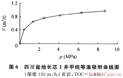 圖6為長(zhǎng)芯1井120m處所取巖心的等溫吸附曲線(70℃等溫),該樣品為志留系龍馬溪組黑色頁(yè)巖,有機(jī)碳含量為5.9%,成熟度為3.26%。在70℃等溫條件下,隨著壓力增高,頁(yè)巖吸附甲烷的能力(V)逐漸增大,在壓力達(dá)到8.5MPa時(shí),頁(yè)巖的甲烷吸附能力達(dá)到1m3/t。通過(guò)與美國(guó)5大頁(yè)巖氣盆地的頁(yè)巖等溫吸附曲線對(duì)比可以發(fā)現(xiàn),長(zhǎng)芯1井志留系頁(yè)巖的吸附能力除與圣胡安盆地白堊系Lewis頁(yè)巖相近外,均低于其他盆地的頁(yè)巖。究其原因,筆者認(rèn)為很可能與成熟度有關(guān)。目前發(fā)現(xiàn)的進(jìn)行商業(yè)開發(fā)的美國(guó)5大頁(yè)巖氣盆地的頁(yè)巖,成熟度普遍不高,介于0.4%~1.9%之間。而熱成因的頁(yè)巖氣藏,頁(yè)巖成熟度較高,大多在1.1%以上,最高不超過(guò)3%。四川盆地長(zhǎng)芯1井志留系頁(yè)巖的成熟度過(guò)高,Ro達(dá)到了3.26%,已進(jìn)入過(guò)成熟階段,這可能是導(dǎo)致其吸附能力較低的主要原因。另仔細(xì)分析可以發(fā)現(xiàn),美國(guó)5大頁(yè)巖氣盆地中圣胡安盆地白堊系Lewis頁(yè)巖的成熟度最高,為1.6%~1.88%,其頁(yè)巖的吸附能力則最小。