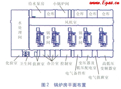 鍋爐房與變配電站、調(diào)壓站的相對(duì)位置見(jiàn)圖1,鍋爐房平面布置見(jiàn)圖2。